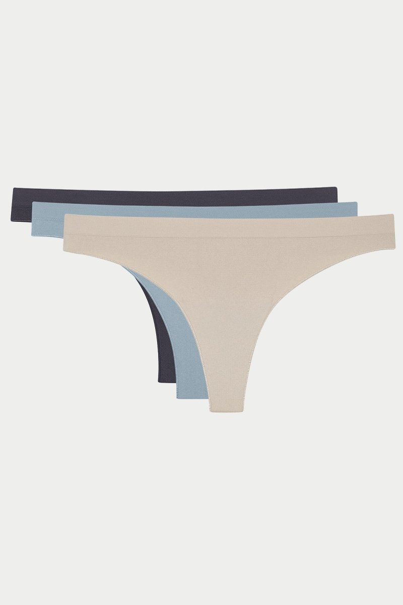 Dikişsiz poliamit Brezilya modeli külot. 3’lü paket, farklı düz renklerde. Yumuşak dokulu kumaş. Elastik bel.